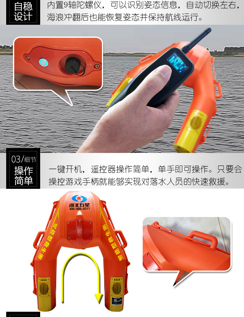 河北五星“霸王龍”WX-500型水上救生遙控機(jī)器人(智能型救生圈、智能型遙控救生圈)用于落水人員的救援,時速可達(dá)4米/秒,一旦碰到險情,會以很快的速度來到你身邊。智能型救生圈操作簡單,只要會操控游戲手柄就能夠?qū)崿F(xiàn)遠(yuǎn)距離、快速、精準(zhǔn)送達(dá),實(shí)現(xiàn)對落水人員的快速救援。